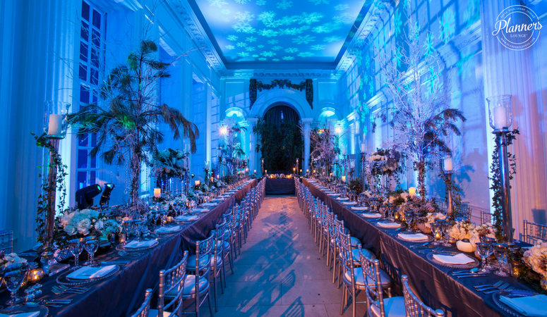The Winter Whites Ball embodied a winter wonderland event design straight from the pages of Dr. Zhivago. In the absence of snow, we created our own. Royal florist Simon Lycett dressed rooms with oversized winter trees, stripped of bark. Tables adorned with white roses, green foliage, and silver pine cones. Tall silver candlesticks and candelabra held white church candles. A stunning lighting production sprinkled the walls ice blue and white snowflakes. The result, dramatic.